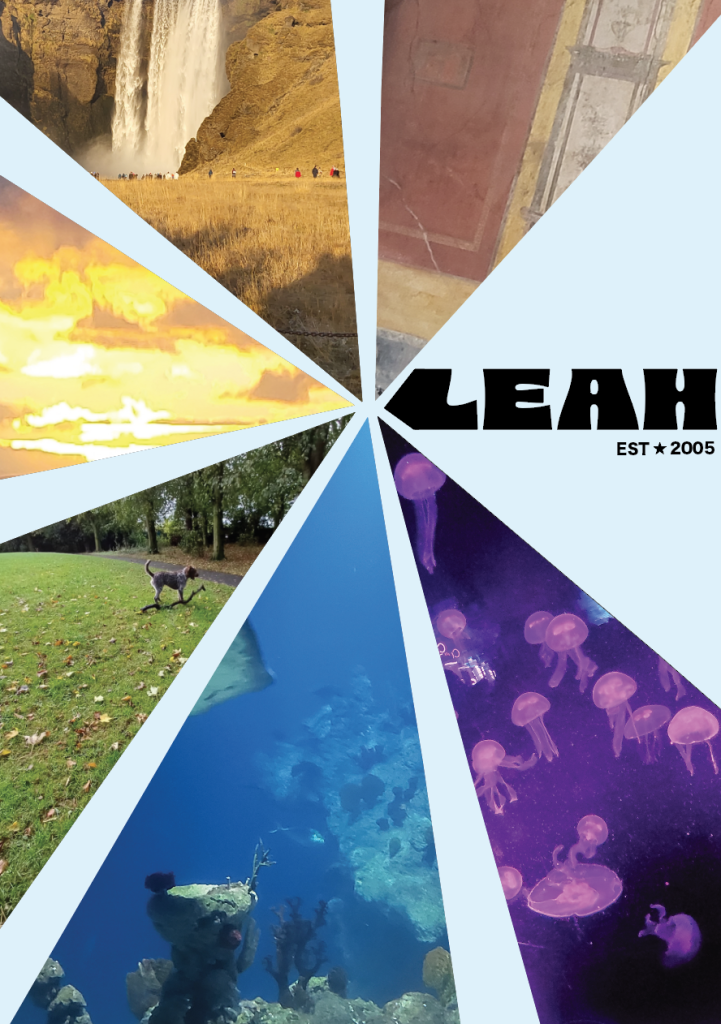 For my second portrait I wanted to show off more of my photography skills. I decided to split my page into 7 different sections. I left one of the sections blank, so I had space for my name and anything else I wanted to add. I wanted the pictures to be in rainbow order, so I chose certain pictures that have a defined colour palliate. “Colour harmony delivers visual interest and a sense of order”( Colormatters, N.D)and the pictures I chose are all taken by myself at different points in my life. The first picture I used for the red space was a photo I took in Italy, in the ruins of Pompei. The next two pictures I used were taken in Iceland, which my favourite place I have visited. The green image is a picture I took in my local park of my dog playing. The last two pictures are I took at the aquarium which is one of my favourite places to visit.