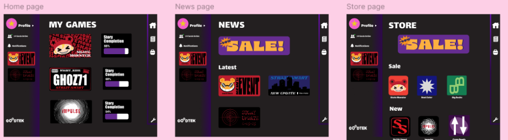 These are my home, store and news pages. Apart from the icons and pop out being switched to the side, the pages remain similar to the ones in the app.