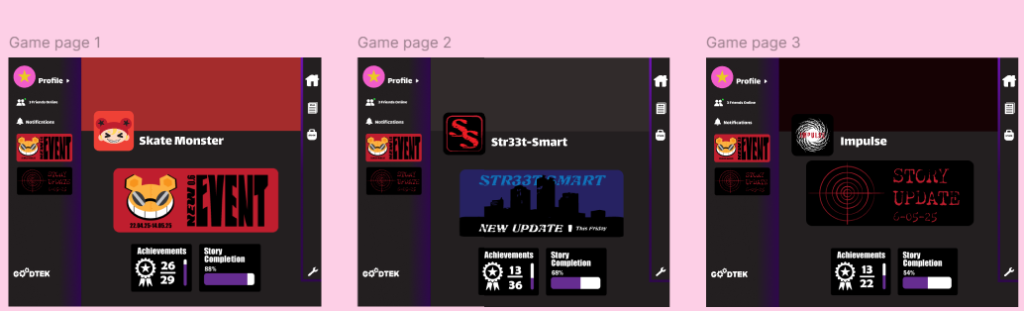 These are my game pages. The main difference between them in the website and app is the top of the website, this is because a big banner in the same place as the app will take up most of the page. So instead I have used the icons and placed a coloured banner behind them.