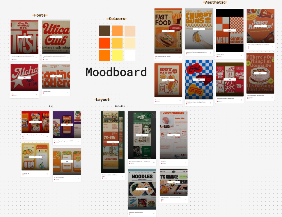 Here is a mood board I created to give the stakeholders a good idea of the overall aesthetic of the festival app and website. I’ve chosen more warmed tone colours to give the feel of summer, these colours are also associated with fast food like burgers as they are the main colours of advertisement for them and also colours of the food themselves. The mood board also shows an old American diner look, this could give older users a feeling of nostalgia.