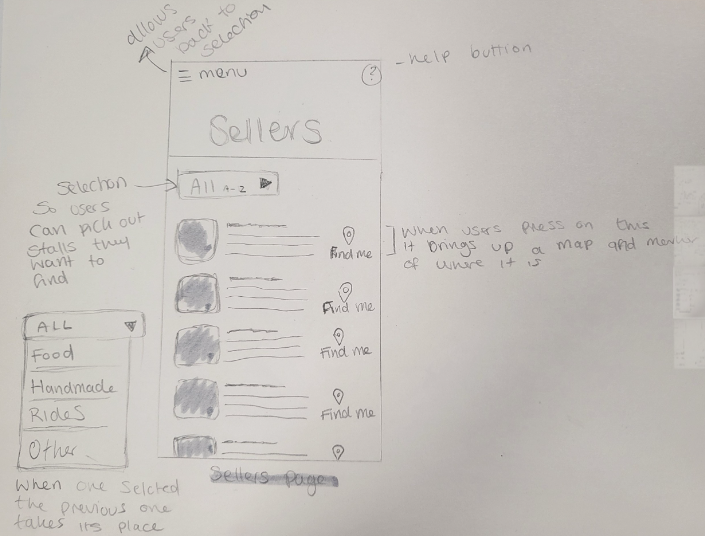 This is a prototype of my sellers page. This will inform user of what types of stalls there will be and what they are selling so it can get users interested in the festival. Another reason this is important is so users can check to see if any sellers will be serving food that applies to their specific diet or allergies. Also another feature I want to add to my work is a find me button, pressing this will give the user a marked location on a map showing them exactly where it is. If I don’t have time to do this I will instead add the location e.g. number of stall and zone its in.