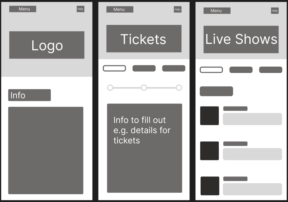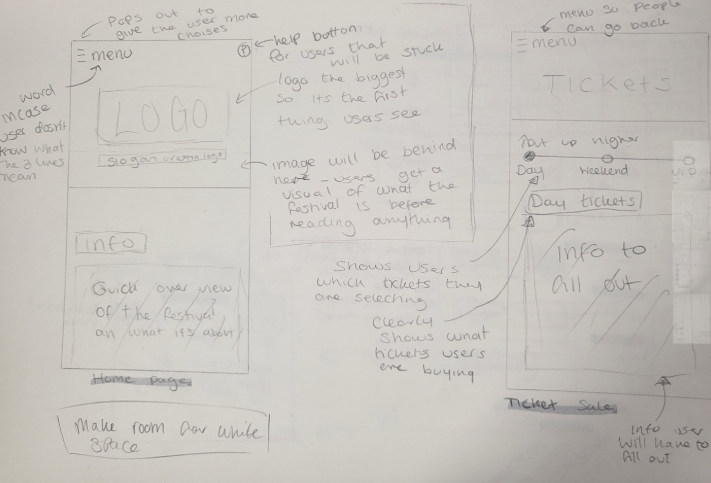 This is the prototype for my home page and ticket sale page. On the page I’ve annotated around key points I want to try include in my work such as a help button to help users who are having trouble navigating the app or website. Another key thing I want to include in my final design is a menu button, this is so users can find what thy are looking for in one area and need minimal movement in the process.