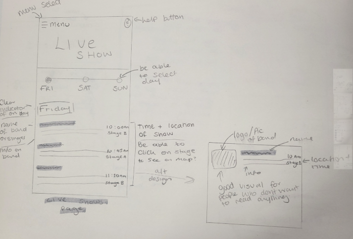 This is my prototype for my live shows page. This will inform the user on the live events that will be preforming and also which stage the performance will be taking place. I prefer the design on the right for the way the events will be displayed.