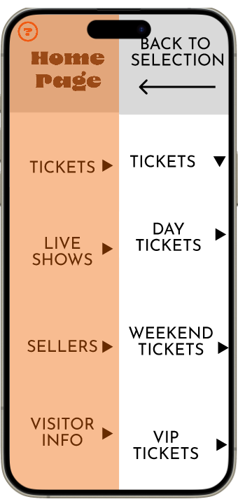 This is another set of pages I made to show off the types off stalls that will be there as based on my research users like to know what will be at the festival before they get there especially for families who want to plan out their day. This is important as it can get users excited for what will be at the festival and can also allow users to see if there will be any food served that will cater to their dietary needs. This was important for my festival as a lot of users in my user journey map had a variety of different diets. Each type of stall is clearly indicated by the colour box its in. To the right of the page is a key that when clicked pulls out tells users what the colours mean.