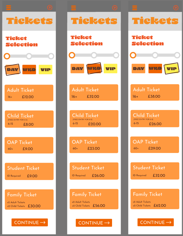 Here are some rejected deigns from creating my mid-fidelity. The first design I rejected was for the overlay that appears when you press the menu button then one of the options. I first designed it so when a selection is made, e.g. the tickets page, the second overlay appears next to the first overlay with an orange translucent rectangle covering the first overlay so nothing can be selected. However, this didn’t work out as this could confuse the user due to how busy the page is and the first overlay, while having a translucent cover over it, still looking like it can be selected. I changed this by having the second overlay directly appear over the first one.